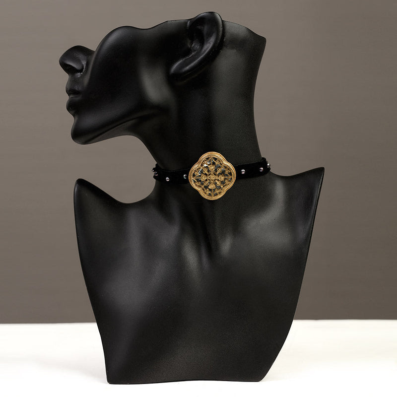 Inspired from the Spanish Alhambra, the 'Thewa' piece takes centre-stage in this modern and stylish choker finished with a sleek and pearl-sewn velvet strap. The Thewa piece is with 24k gold motifs on glass, encased in gold dipped silver.